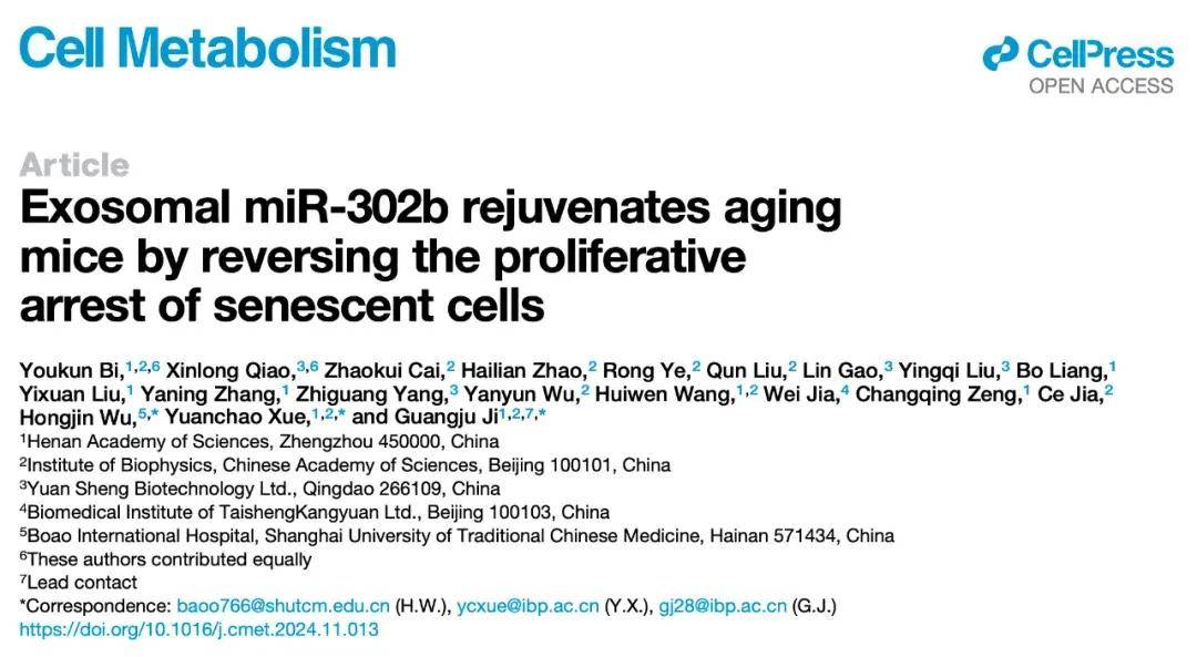 2025年1月15日,一项开创性的研究成果在《细胞代谢》(Cell Metabolism)——《细胞》(Cell)杂志的子刊上发表,该研究由河南省科学院、中国科学院生物物理研究所的姬广聚研究员、薛愿超研究员以及上海中医药大学博鳌国际医院的吴红金教授等科研人员共同完成。论文题为《外泌体miR-302b通过逆转衰老细胞的增殖停滞使老年小鼠恢复活力》,这项研究不仅首次证实了细胞衰老这一过程是可以被逆转的,而且提出了一种全新的“返老还童”策略——“Senoreverse”。